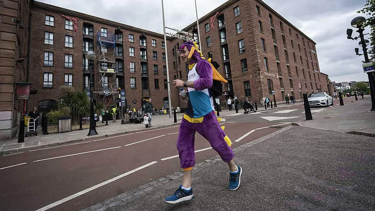 On Monday the 21st of June, Graeme set off for his now 10k and 200 push-ups charity challenge - 20 push-ups at the end of every 1km - all whilst dressed as Spyro the Dragon! His journey took him through Liverpool city centre and docks, to a waterfront finish line where he was met by proudly cheering sprites.